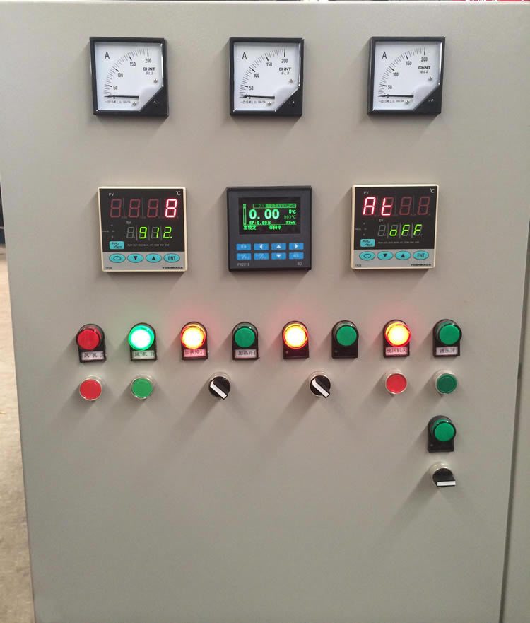 1、控溫儀表采用廈門宇電AI518AP-G-L1智能程序控制儀表,精度0.3級(jí),控溫偏可達(dá)±2℃。人機(jī)界面采用深圳W EINVIEW威綸7吋觸摸屏,通過通信協(xié)議與智能儀表相連,把儀表操作菜單在觸摸屏**展開,這樣操作更真觀,更方便,在不更改儀表參數(shù)時(shí),觸摸屏顯示電爐各區(qū)的工作狀態(tài)。(用戶可以有選擇性的采用)
